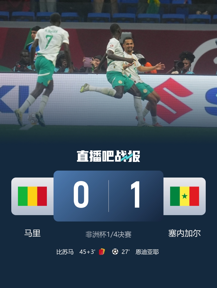 非洲杯-塞内加尔1-0十人马里进四强 恩迪亚耶破门比苏马半场染红
