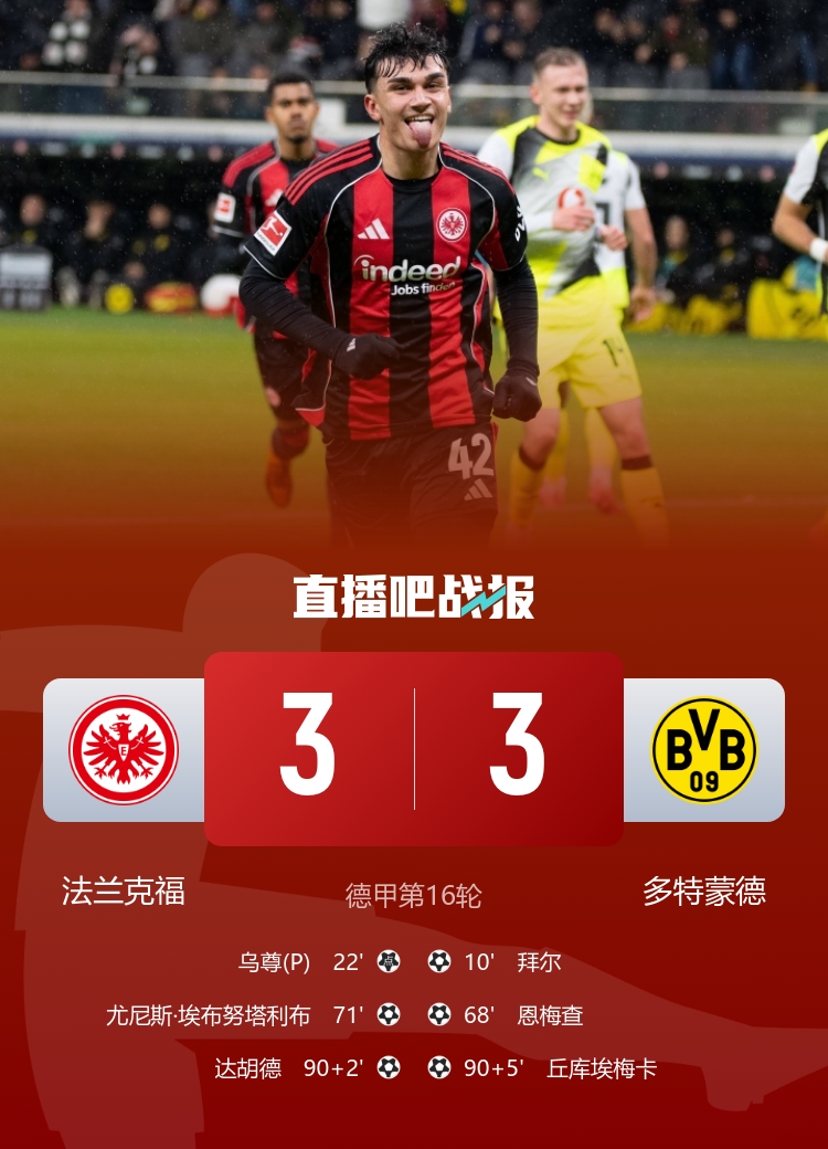 神剧情!多特3-3法兰克福 达胡德92分钟进球丘库埃梅卡95分钟绝平